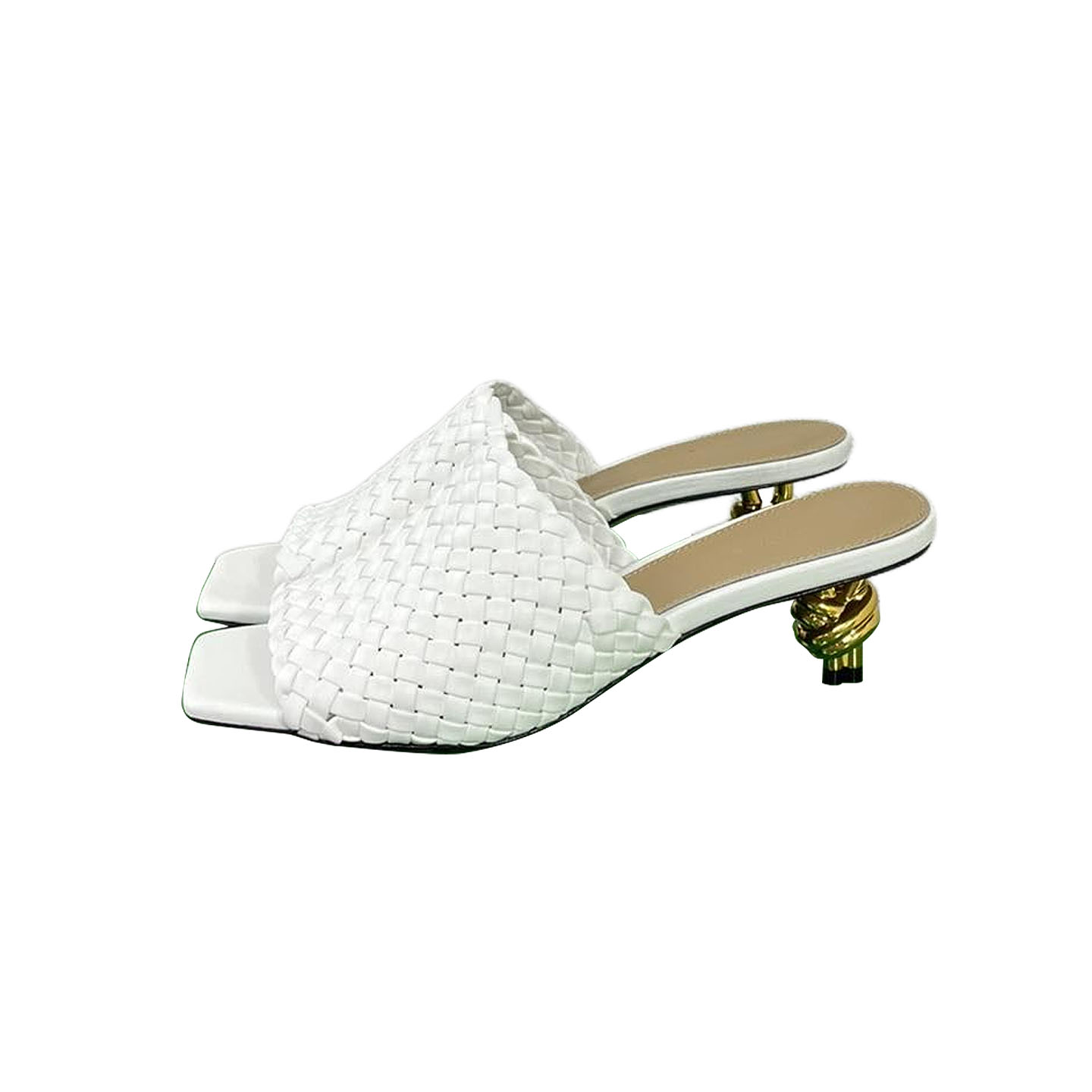 Bottega Veneta Knot Mule In Beige Intrecciato Leather Mule With Gold Finished Metal Knot Heel (Heel Height 9cm)