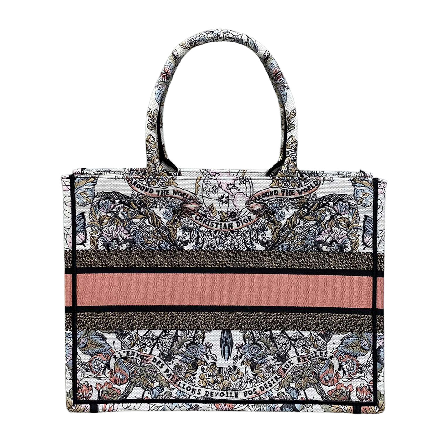 Dior Medium Book Tote White Pastel Pink Butterfly Around The World Embroidered Canvas