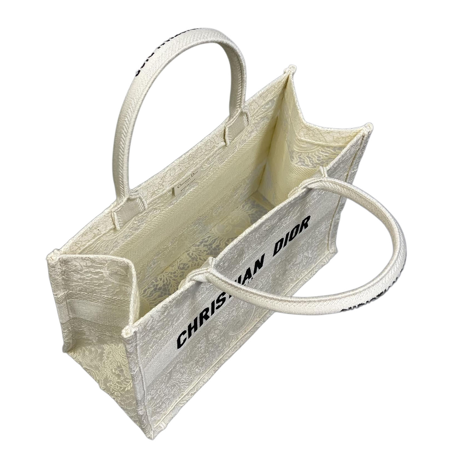 This Dior Medium Book Tote in White Toile de Jouy Soleil Macramé Embroidery is an artistic and luxurious statement. Spacious and lightweight, it’s perfect for travel or daily use. The intricate embroidery showcases Dior’s exceptional craftsmanship. A bold addition for those seeking unique accessories.
