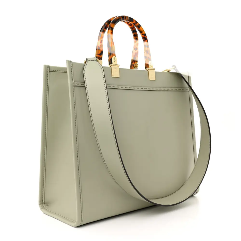 Fendi Medium Logo Embossed Sunshine Shopper Tote Green Tea King Vitello Leather & Plexiglass Gold Hardware