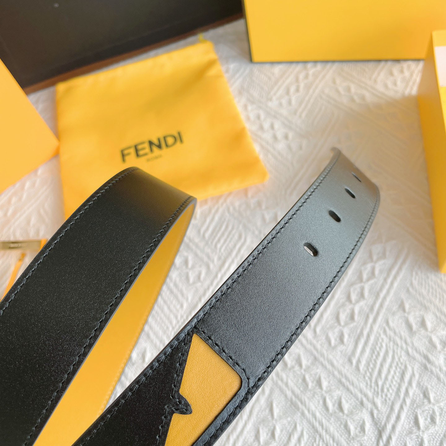 Fendi Men’s FF Monster Eyes Reversible Belt In Black/Yellow/Red Smooth Calfskin With Gold Hardware 35mm