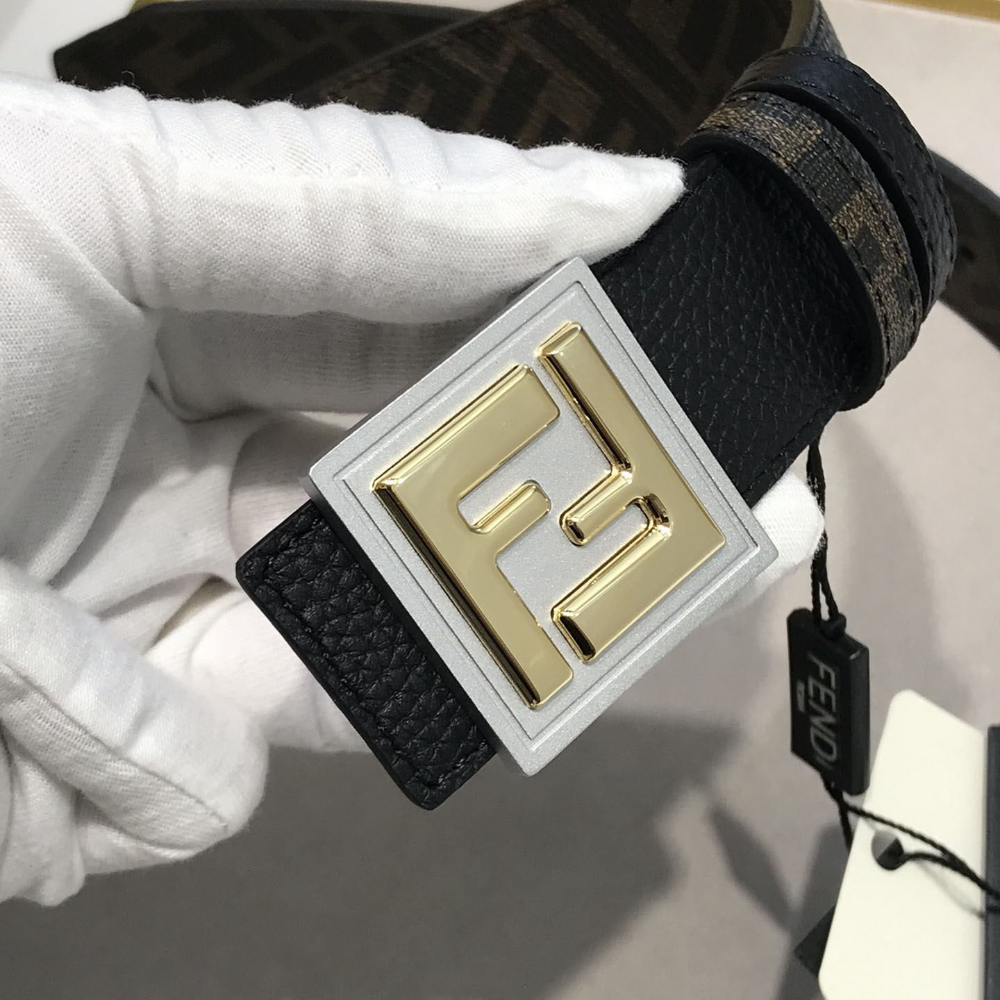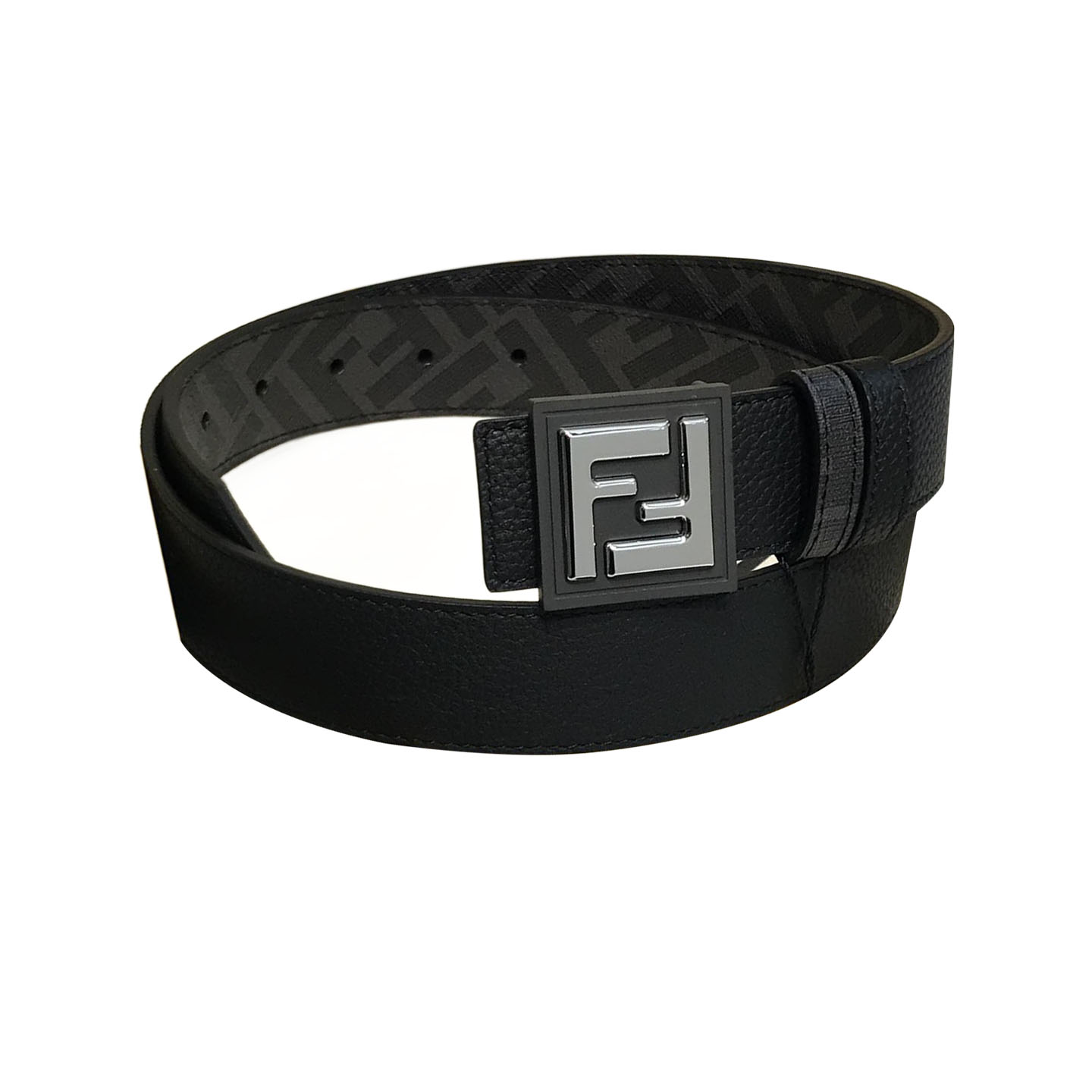 Fendi Men’s Square Buckle Belt In Black/Brown Grained Calfskin And Monogram Canvas With Gold/Silver Hardware 35mm
