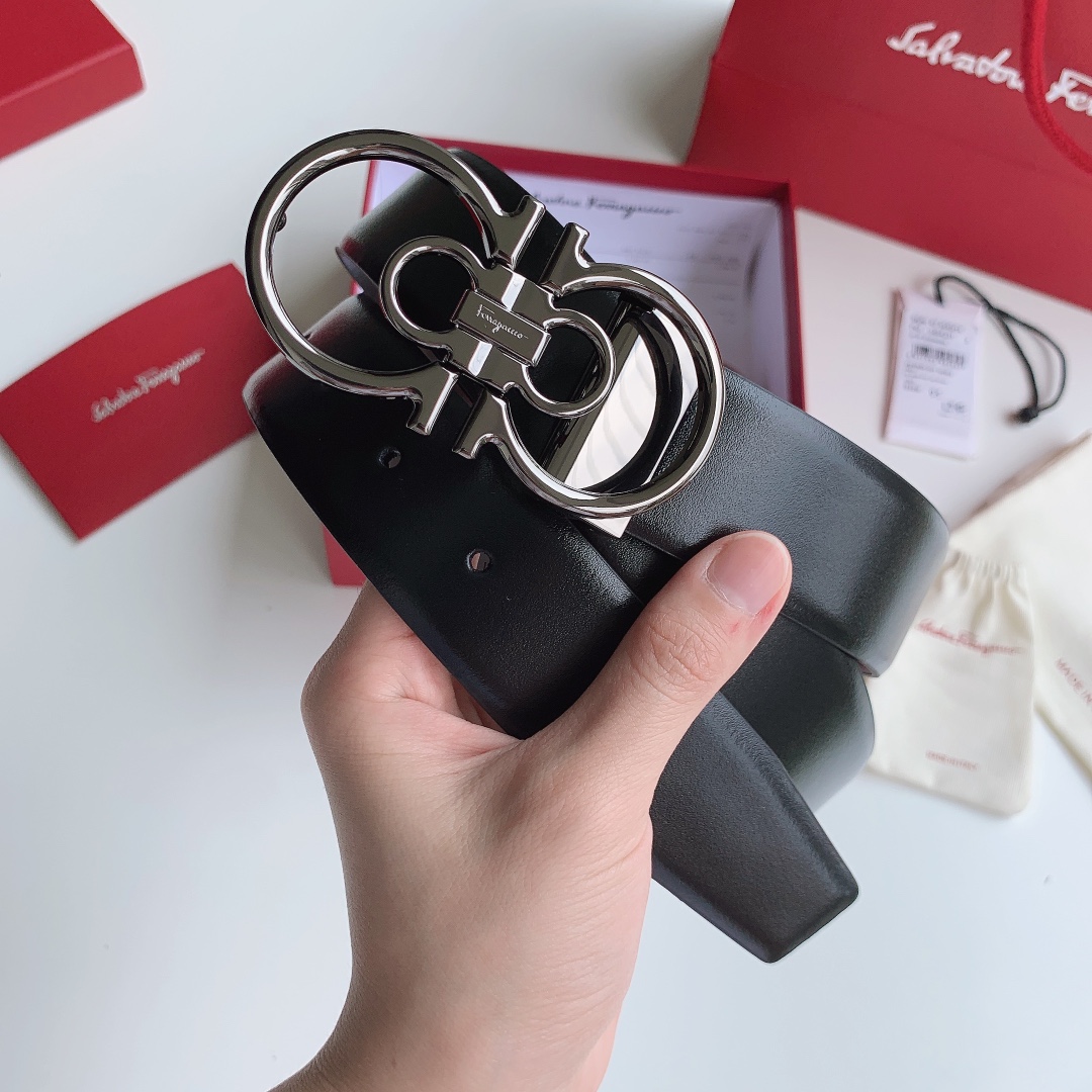 Ferragamo Men’s Double Gancini Buckle Reversible Belt In Black/Coffee Smooth Calfskin With Gold/Silver/Black/Gun Black Hardware 35mm