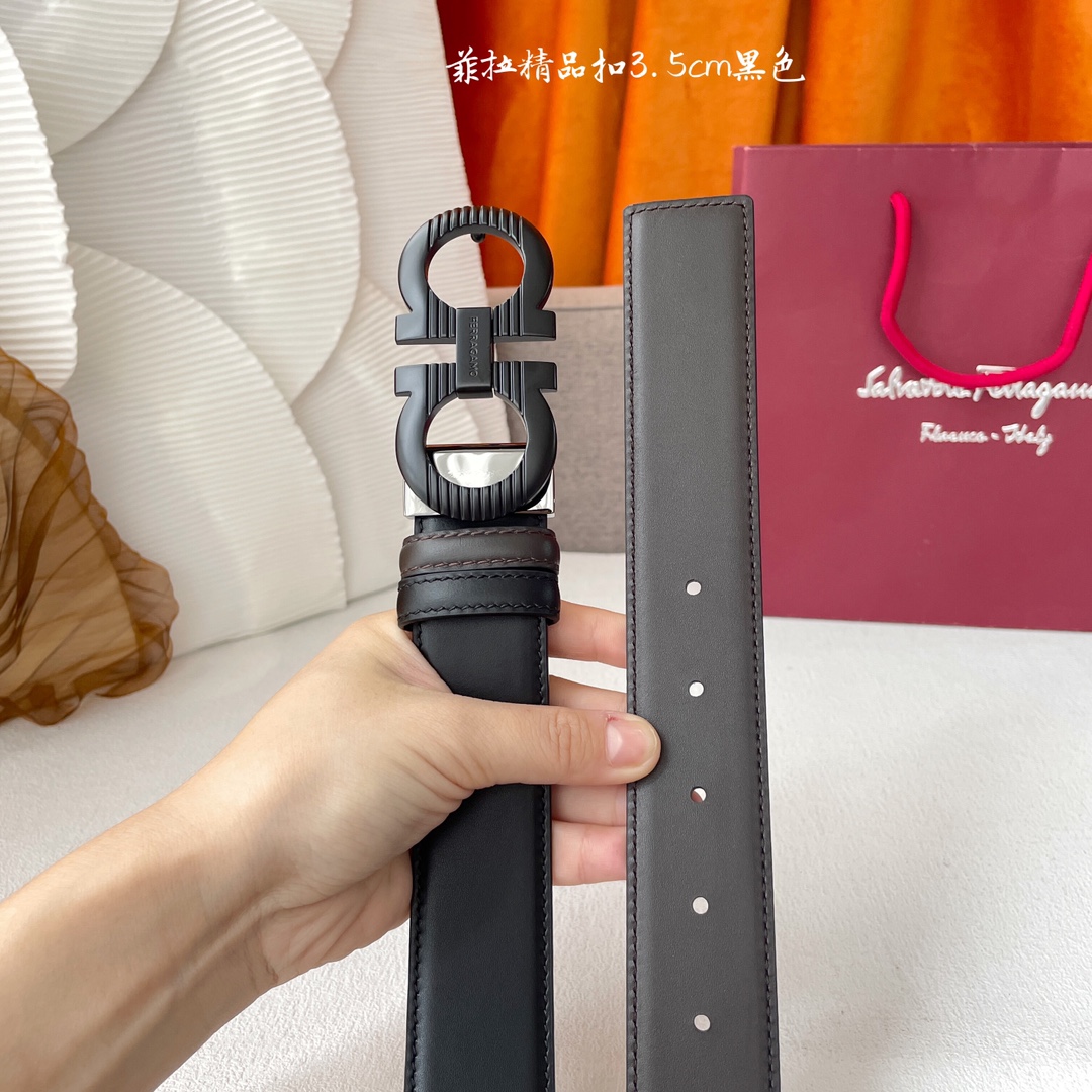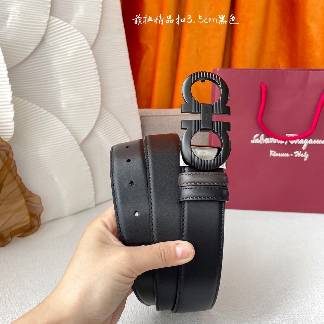 Ferragamo Men’s Double Gancini Buckle Reversible Belt In Black/Coffee Smooth Calfskin With Gold/Silver/Black/Gun Black Hardware 35mm