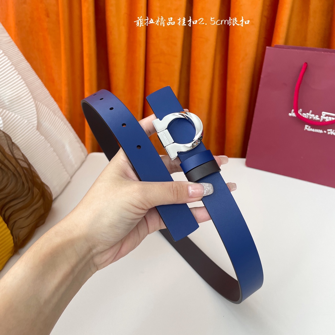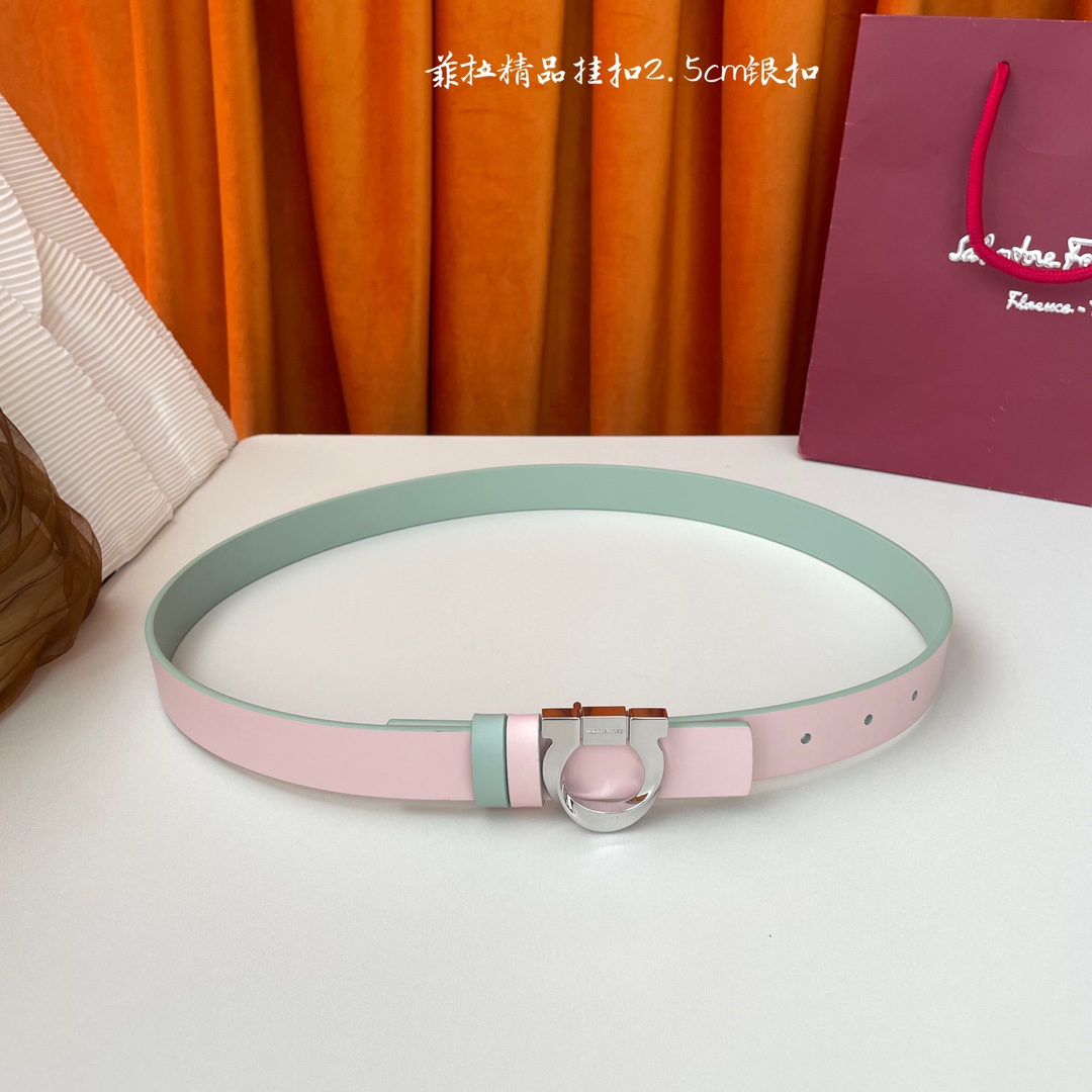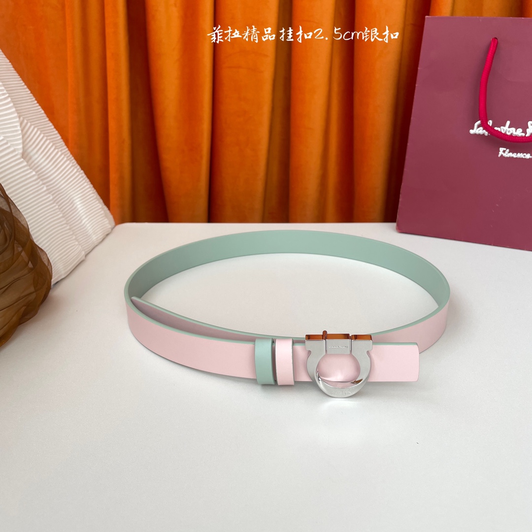 Ferragamo Women’s Gancini Reversible Fixed Belt In Mint Blue/Blue/Red/Black/Pink Calfskin With Gold/Silver Hardware 25mm