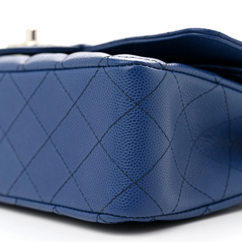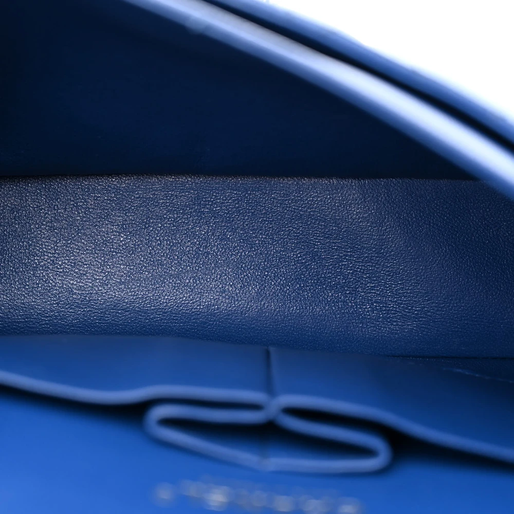 This Chanel Double Flap Medium in Blue Quilted Caviar Leather with Silver Hardware is a sophisticated addition to any collection. The durable caviar leather is accentuated by Chanel classic quilted design. Silver hardware adds a modern contrast to the vibrant blue color. Spacious enough for essentials, ideal for both day and evening use. The double flap closure enhances security and style. A perfect blend of practicality and elegance.