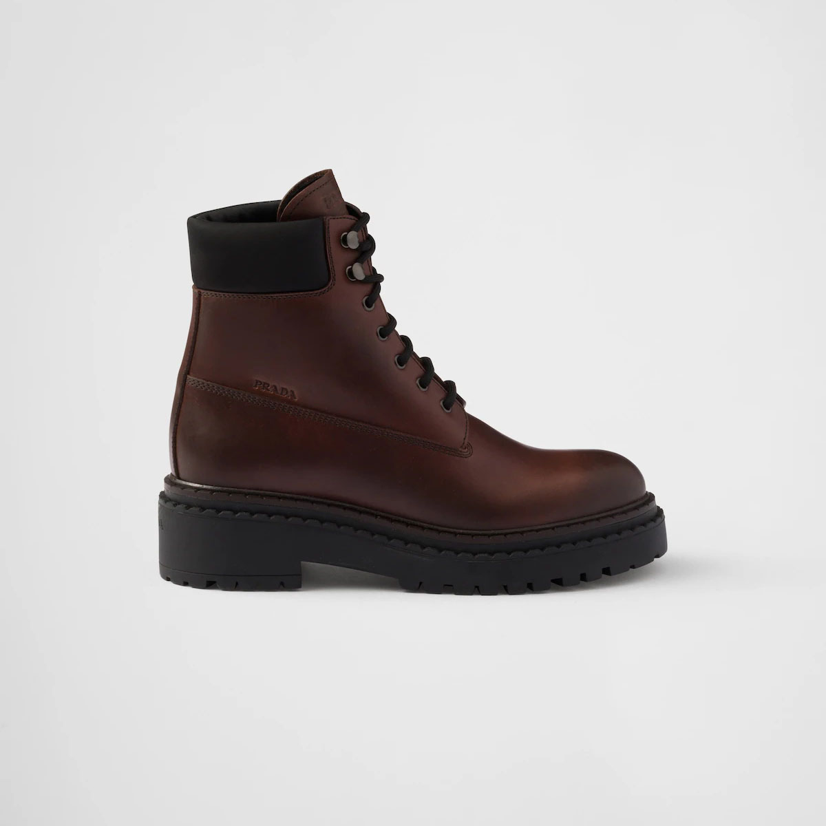 PRADA Dark brown leather and recycled nylon ankle boots