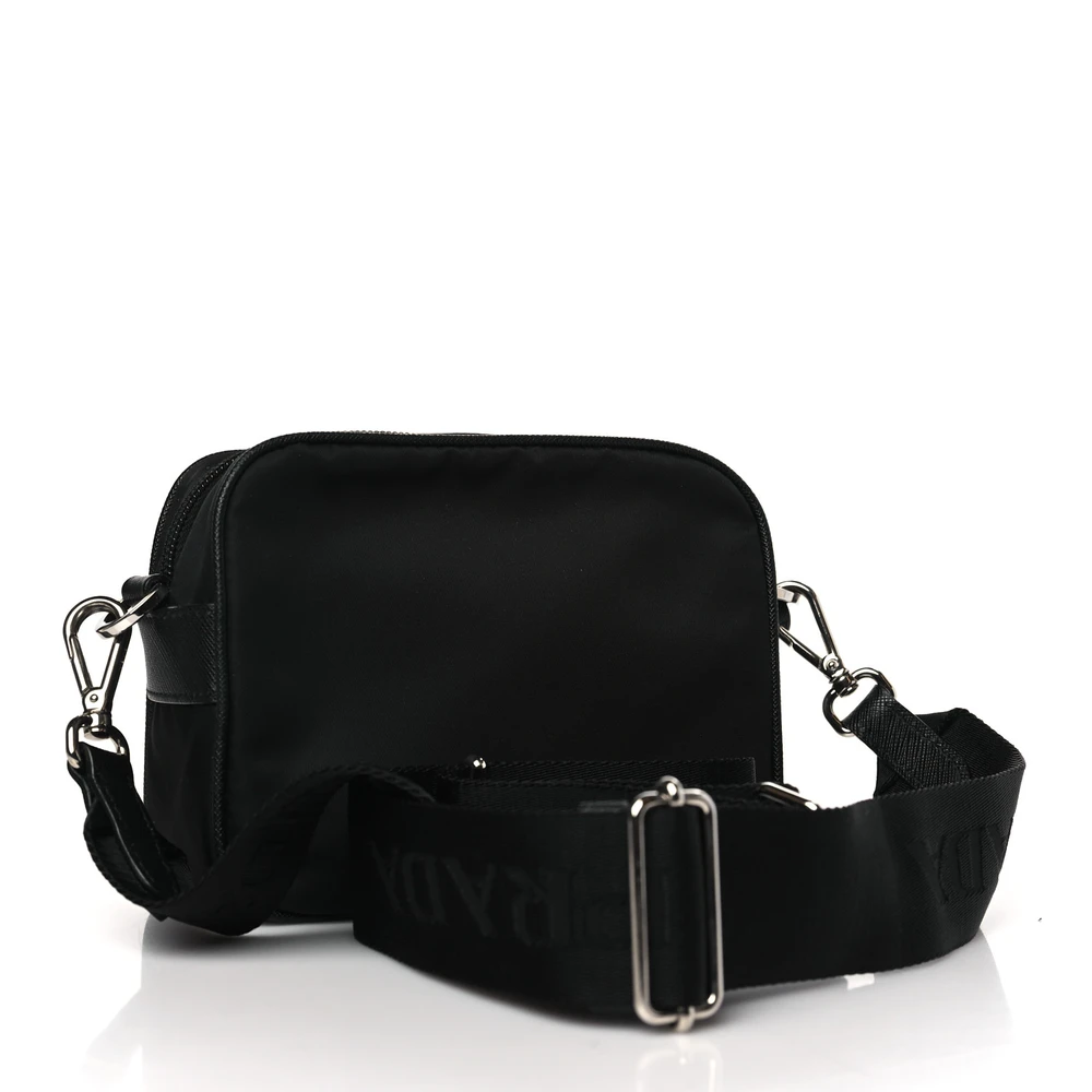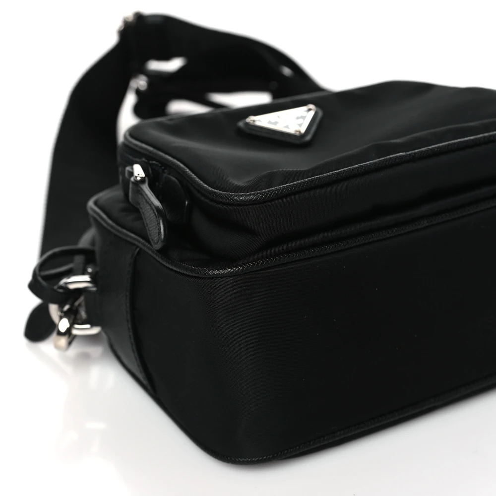 This Prada Medium Brique Crossbody Messenger Bag in Black combines Tessuto nylon and Saffiano leather. Silver hardware adds a sleek and modern look. Adjustable strap ensures versatile carrying options. Spacious compartments provide practical storage. Perfect for work or casual settings. A durable and stylish bag.