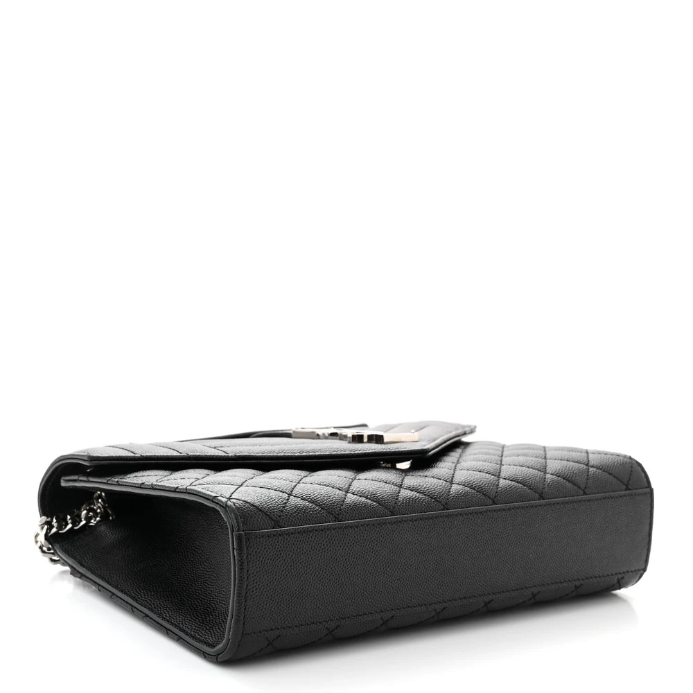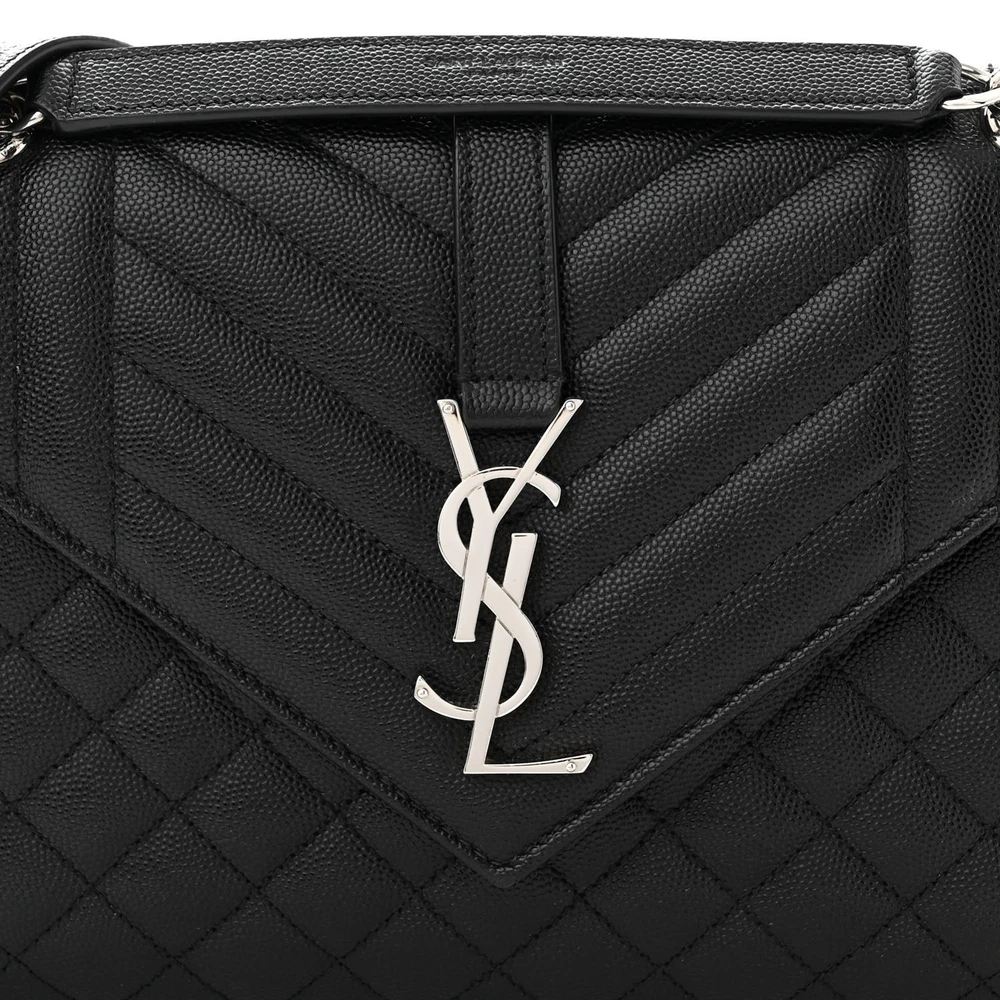 This Medium Satchel in Black features Triquilt Monogram Grain De Poudre Textured Mixed Matelasse Leather with silver hardware. The intricate quilting pattern creates a luxurious texture, complemented by the iconic YSL logo. Spacious and versatile, the bag includes a top handle and a detachable strap for multiple carrying options. Its elegant design is perfect for both professional and social settings.